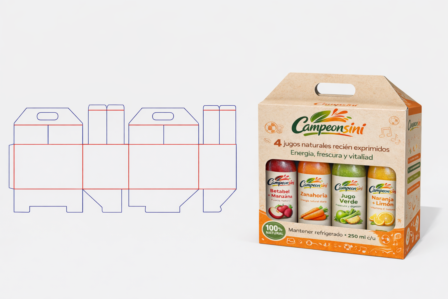 La caja puede fabricarse en dos versiones: una presentación compacta para 4 jugos, delgada y fácil de transportar, y otra en la que caben perfectamente 8 botellitas. El precio por paquete resulta más económico que comprar cada jugo por separado, lo que incentiva el consumo semanal y reduce compras impulsivas menos saludables.